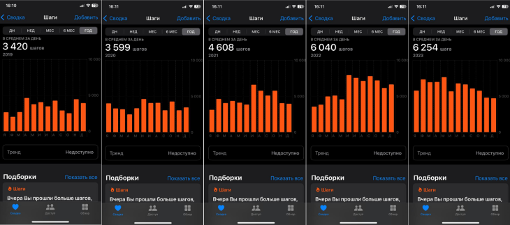 Данные телефона по годам: с 2019-го по 2023-й, усреднённое количество пройденных шагов за год, погрешность 5-20% в меньшую сторону: